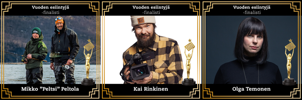 Vuoden esiintyjä -finalistit: Mikko ”Peltsi” Peltola, Kai Rinkinen ja Olga Temonen.